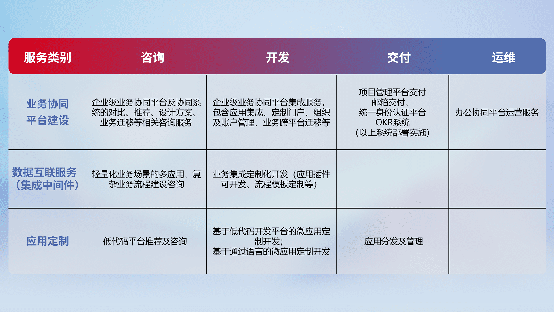 针对钉钉、、、、企微、、、IDaas等平台级产品提供产品的规划、、、、方案、、、交付、、、、定制化开发等服务,,,,实现如统一协同办公、、、智能客户服务、、、、混合会议管理、、、智能数据查询、、等业务场景,,实现数字化转型。。。。
