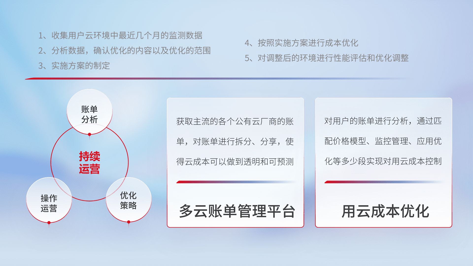 通过多云纳管,,,以统一的资源数据模型把客户的云资源进行抽象和封装,,进而实现对多云资源的统一操作,,保障云资源管理的可靠性、、稳定性与可用性。。量身定制化运维内容,,配置、、、开发运维、、补丁管理、、备份、、、、监控、、、、认证和访问管理、、审计和日常巡检等,,,保障在用云过程中的可靠度,,稳定度以及高可用率。。